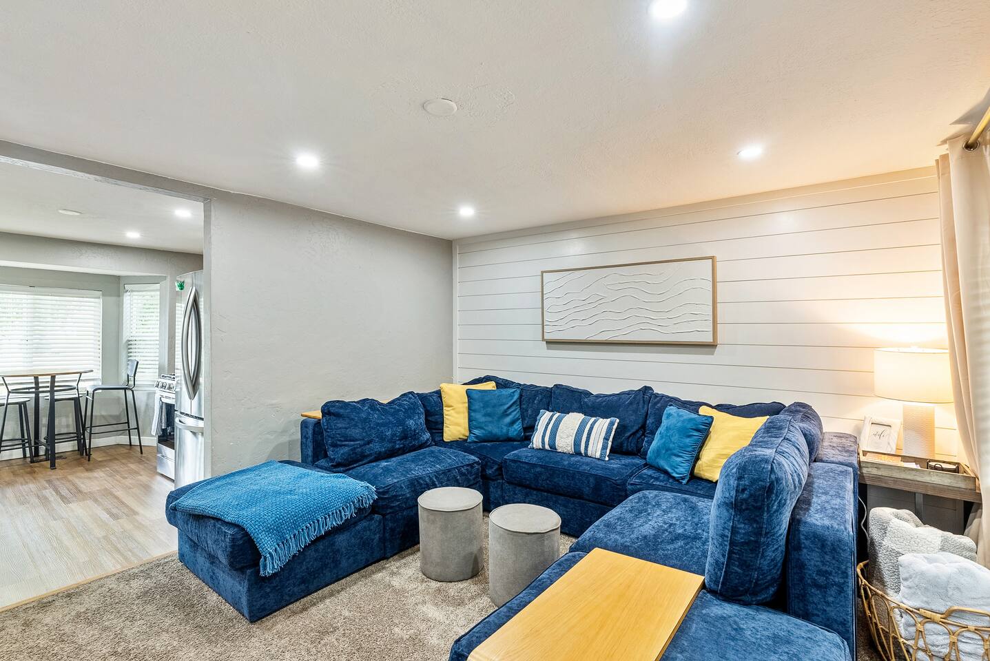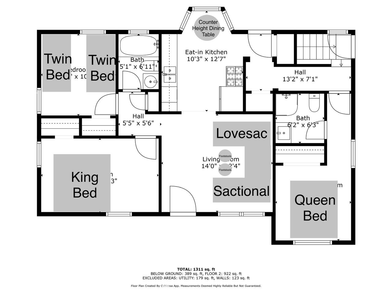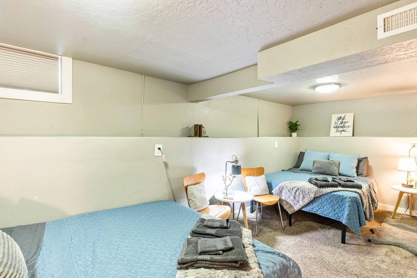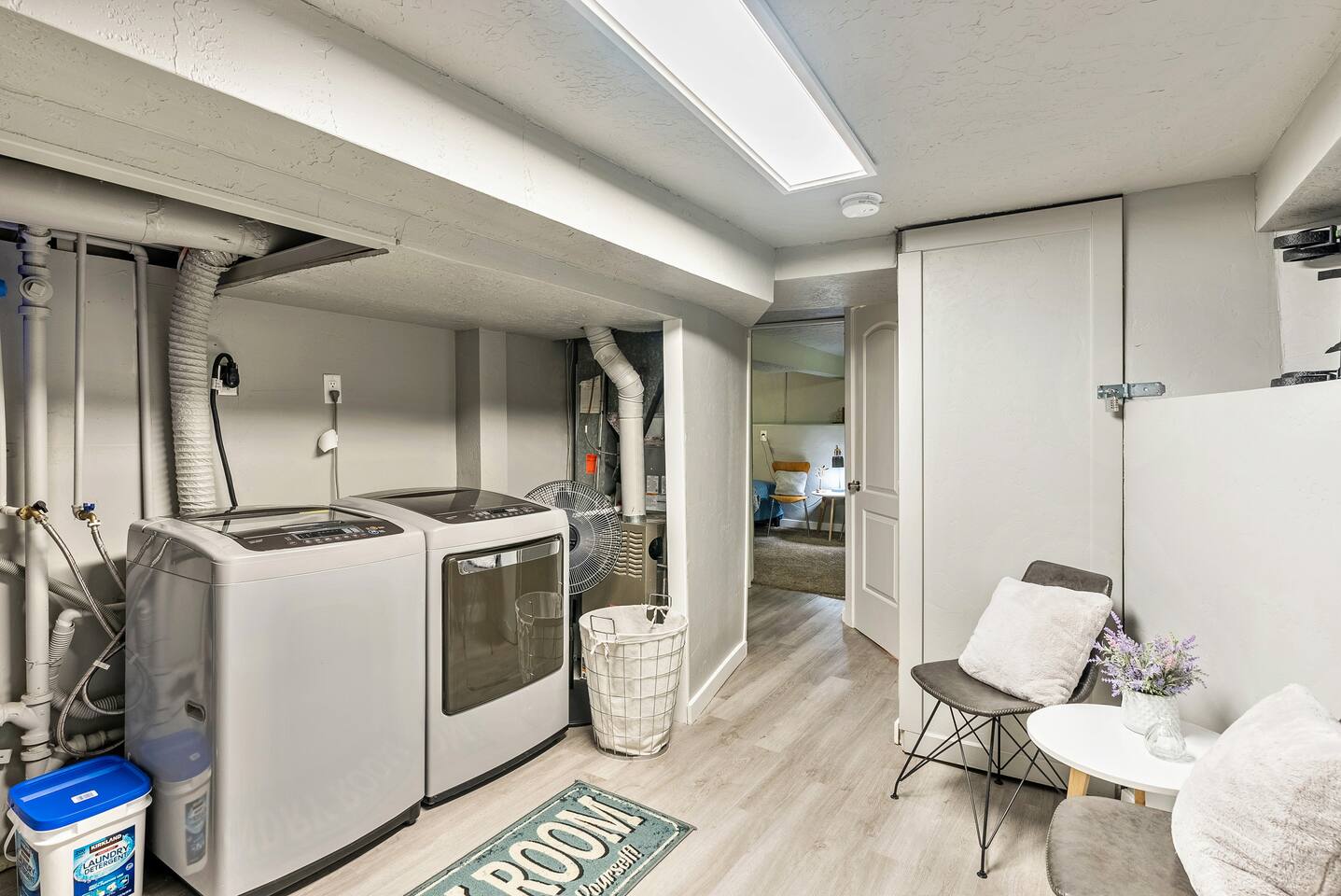 The house is 5 bedrooms and 2.5 bathrooms. The 5th bedroom is a non-conforming den with an accordion style privacy curtain. The home sleeps 10 adults comfortably in beds and we can accommodate up to 12 guests including children. On the main level, you will enter into a living space with a TV, a large Lovesac Sactional couch, 2 footstools, and 6 TV tray tables. Off to the left there are 2 bedrooms (1 King & 2 Twin) and a shared hall bath with a bathtub. Through the kitchen, you will see a small bistro table with 4 stools. This is the only “dedicated” dining space we have, but the folding TV tray tables should accommodate additional guests in the living room. Down the back hall is the owner’s suite with a Queen bed and its own en-suite that has a walk in shower. When you head down the stairs to the basement, the laundry room is in the common area and it is stocked with all the necessities to refresh your clothes along. Off of the laundry room is a half bathroom, a bedroom with 2 full size beds & a desk, and there is the non-conforming bedroom which has 2 twin beds, tv, chairs, and lots of board games, toys, and puzzles for guests to enjoy. Each bedroom is equipped with a sound machine, a fan, and the basement rooms each have a space heater to help maintain a comfortable temperature in the winter. All bedrooms besides the den have 2 luggage racks in each closet. The home is surprisingly spacious with plenty of room to spread out! If you are traveling with children or a large family, we have travel cribs/bassinet, strollers with bassinet attachments, folding wagon, baby monitors, pack & plays, baby carriers, potty seats, bath toys, a baby bath tub, and lots of other baby gear we are happy to share with families to help lighten the load while traveling. Please inquire with us and we will be happy to give you the whole list of items we can provide for our guests and help accommodate all of your needs.