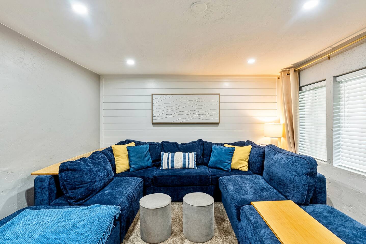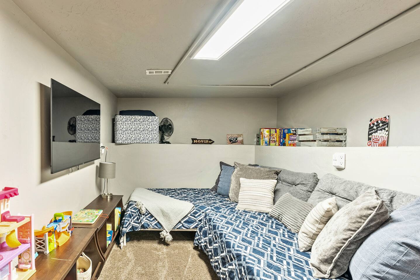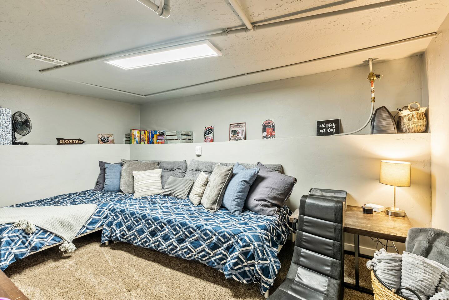 The house is 5 bedrooms and 2.5 bathrooms. The 5th bedroom is a non-conforming den with an accordion style privacy curtain. The home sleeps 10 adults comfortably in beds and we can accommodate up to 12 guests including children. On the main level, you will enter into a living space with a TV, a large Lovesac Sactional couch, 2 footstools, and 6 TV tray tables. Off to the left there are 2 bedrooms (1 King & 2 Twin) and a shared hall bath with a bathtub. Through the kitchen, you will see a small bistro table with 4 stools. This is the only “dedicated” dining space we have, but the folding TV tray tables should accommodate additional guests in the living room. Down the back hall is the owner’s suite with a Queen bed and its own en-suite that has a walk in shower. When you head down the stairs to the basement, the laundry room is in the common area and it is stocked with all the necessities to refresh your clothes along. Off of the laundry room is a half bathroom, a bedroom with 2 full size beds & a desk, and there is the non-conforming bedroom which has 2 twin beds, tv, chairs, and lots of board games, toys, and puzzles for guests to enjoy. Each bedroom is equipped with a sound machine, a fan, and the basement rooms each have a space heater to help maintain a comfortable temperature in the winter. All bedrooms besides the den have 2 luggage racks in each closet. The home is surprisingly spacious with plenty of room to spread out! If you are traveling with children or a large family, we have travel cribs/bassinet, strollers with bassinet attachments, folding wagon, baby monitors, pack & plays, baby carriers, potty seats, bath toys, a baby bath tub, and lots of other baby gear we are happy to share with families to help lighten the load while traveling. Please inquire with us and we will be happy to give you the whole list of items we can provide for our guests and help accommodate all of your needs.