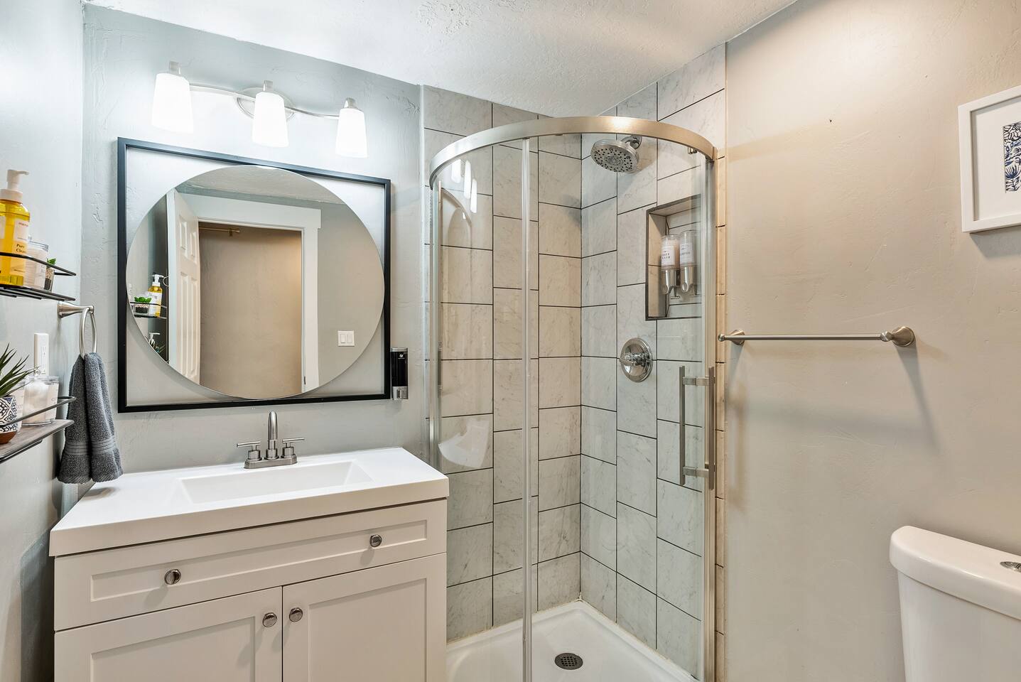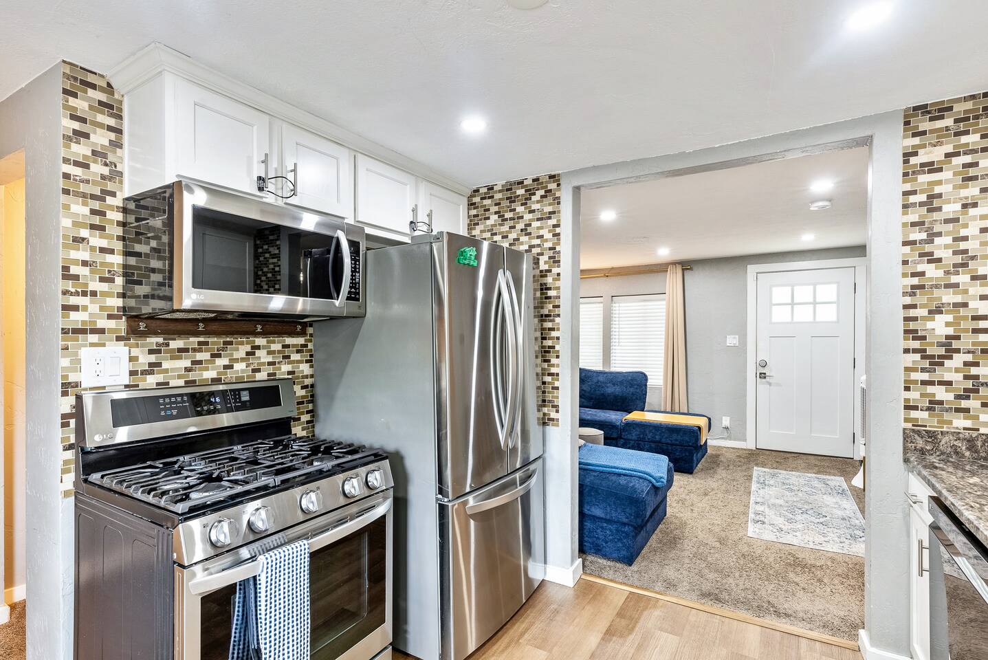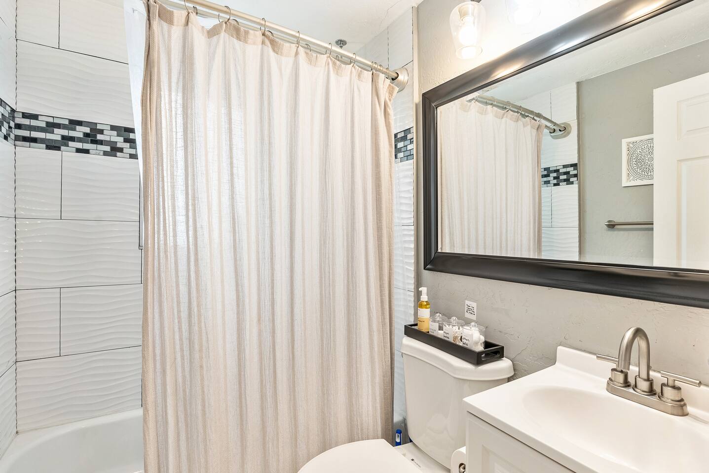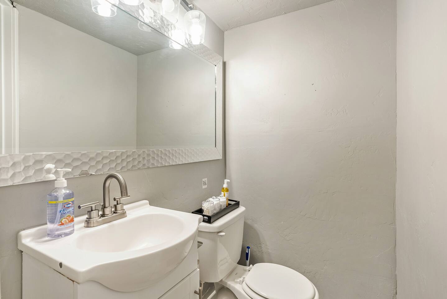 The house is 5 bedrooms and 2.5 bathrooms. The 5th bedroom is a non-conforming den with an accordion style privacy curtain. The home sleeps 10 adults comfortably in beds and we can accommodate up to 12 guests including children. On the main level, you will enter into a living space with a TV, a large Lovesac Sactional couch, 2 footstools, and 6 TV tray tables. Off to the left there are 2 bedrooms (1 King & 2 Twin) and a shared hall bath with a bathtub. Through the kitchen, you will see a small bistro table with 4 stools. This is the only “dedicated” dining space we have, but the folding TV tray tables should accommodate additional guests in the living room. Down the back hall is the owner’s suite with a Queen bed and its own en-suite that has a walk in shower. When you head down the stairs to the basement, the laundry room is in the common area and it is stocked with all the necessities to refresh your clothes along. Off of the laundry room is a half bathroom, a bedroom with 2 full size beds & a desk, and there is the non-conforming bedroom which has 2 twin beds, tv, chairs, and lots of board games, toys, and puzzles for guests to enjoy. Each bedroom is equipped with a sound machine, a fan, and the basement rooms each have a space heater to help maintain a comfortable temperature in the winter. All bedrooms besides the den have 2 luggage racks in each closet. The home is surprisingly spacious with plenty of room to spread out! If you are traveling with children or a large family, we have travel cribs/bassinet, strollers with bassinet attachments, folding wagon, baby monitors, pack & plays, baby carriers, potty seats, bath toys, a baby bath tub, and lots of other baby gear we are happy to share with families to help lighten the load while traveling. Please inquire with us and we will be happy to give you the whole list of items we can provide for our guests and help accommodate all of your needs.